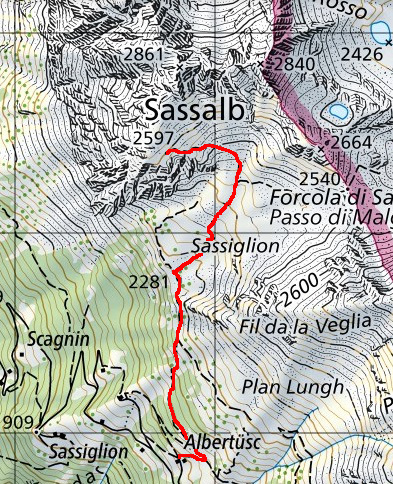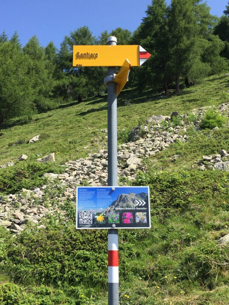 Links von der Alp beginnt der Sentiero Botanico Sassalbo. Dieser wird mit einer Informationstafel vorgestellt und er folgt anfangs dem offiziellen „Sentiero“. Dieser „Sentiero“ führt etwa nach einer Wanderstunde nach rechts, Richtung Forcola di Sassiglion. Unser Sentiero Botanico führt von da an jedoch nach links. Er ist hier mit einer kleinen Informationstafel markiert. Von diesem Zeitpunkt an befindet man sich auf einem alpinen Wanderweg. Das bedeutet, dass dieser schwieriger zu begehen ist und an einigen Stellen loses Geröll den Weg erschwert. Der Sentiero Botanico wird nebst den drei Informationstafeln auch durch Steinmännchen im letzten Abschnitt gekennzeichnet.