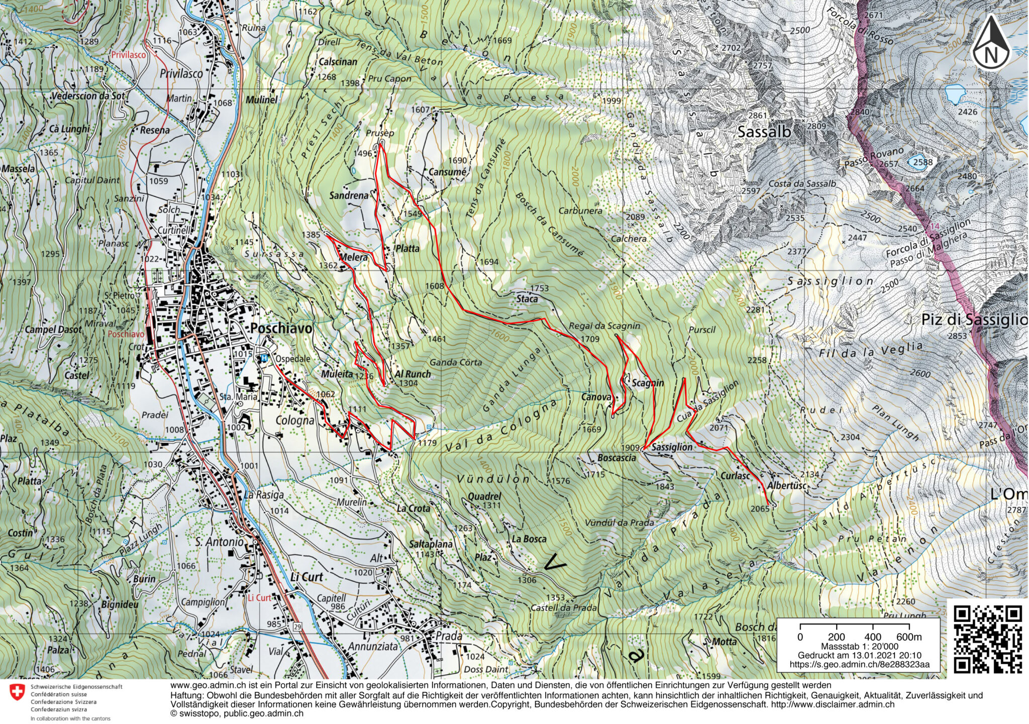 Der Sentiero Botanico beginnt bei der Alp Albertüsc auf 2089 m und endet auf 2597 m Höhe. Um zur Alp Albertüsc zu gelangen, muss man ab Poschiavo der unten in der Karte markierten Strasse folgen. Mit dem Auto dauert die Fahrt ca. 25 min.
